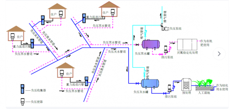 關(guān)鍵設(shè)備:真空泵、負(fù)壓管道、污水收集井(帶氣動(dòng)閥門)。